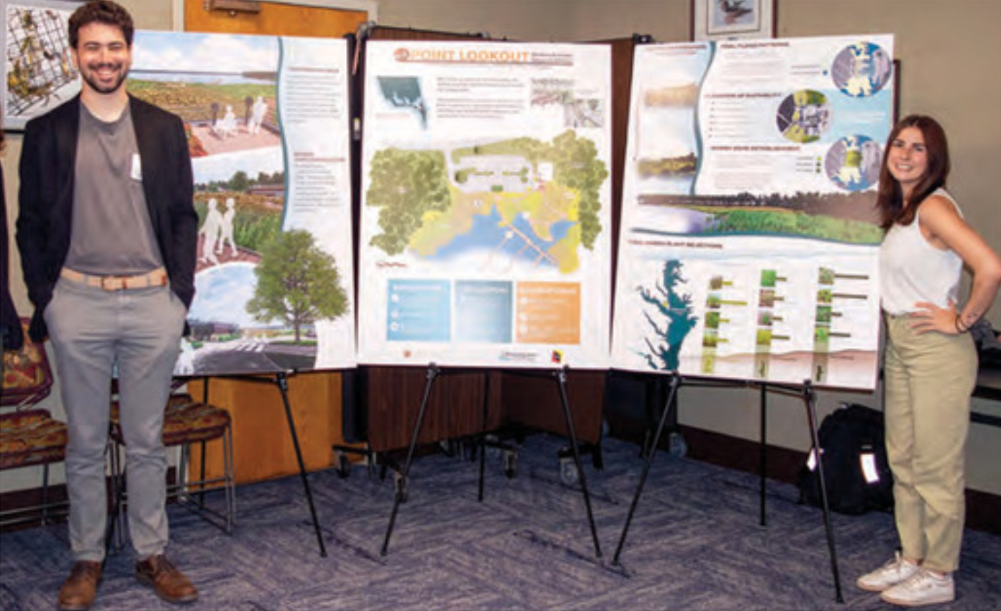 Chris Ellis, a landscape architecture professor, said the class wanted to look at a particular state park and landed on Point Lookout State Park as a fitting site. Located at the southernmost tip of St. Mary’s County at the confluence of the Potomac River and the Chesapeake Bay, Point Lookout is susceptible to sea-level rise and other effects of a changing environment. Sea levels could rise by 1.5 to 2.5 feet at the park over the next 25 to 50 years.